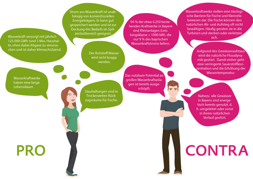 Die Vor- und Nachteile von Wasserkraftwerken und ihres weiteren Ausbaus in den nahezu erschöpfend energetisch genutzten Gewässern Bayerns regen zu Diskussionen zum Thema ökonomische Sinnhaftigkeit und ökologische Verantwortung an. Denn für eine Erhaltung und Erhöhung der biologischen Vielfalt brauchen wir weitestgehend unveränderte Fließgewässer.